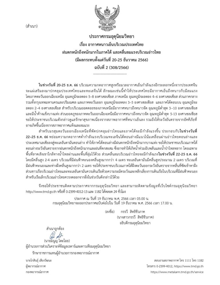 19 ธ.ค. 2023 485 20-25 ธ.ค.นี้ ประเทศไทยจะมีอากาศเย็นถึงหนาวกับมีลมแรง โดยภาคเหนืออุณหภูมิจะลดลง 4–6 องศา