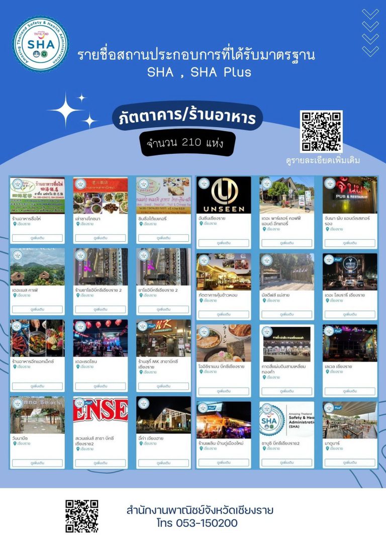 26 ธ.ค. 2023 1348 รวมรายชื่อสถานประกอบการที่ได้รับมาตรฐาน SHA , SHA+ จังหวัดเชียงราย 603 แห่ง