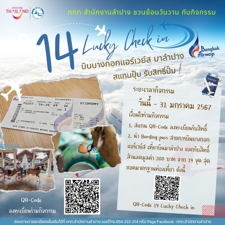 19 ต.ค. 2023 959 14 Lucky Check in บินบางกอกแอร์เวย์ส มาลำปาง สแกนปุ๊บ รับสิทธิ์ปั๊บ เริ่มวันนี้ถึงวันที่ 31 ม.ค.67