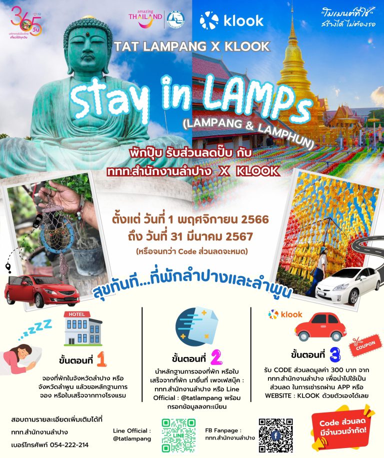 31 ต.ค. 2023 1102 ททท.สำนักงานลำปาง ร่วมกับ Klook จัดกิจกรรม Stay in LAMPs (Lampang & Lamphun) สุขทันที…ที่พักลำปางลำพูน พร้อมรับ CODE ส่วนลด ..