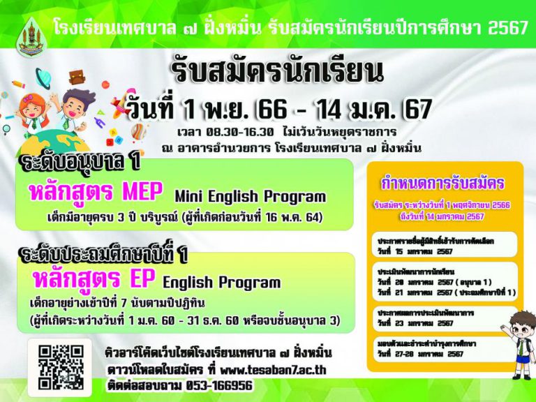19 ต.ค. 2023 4499 รับสมัครนักเรียน ประจำปีการศึกษา 2567 โรงเรียนเทศบาล 7 ฝั่งหมิ่น
