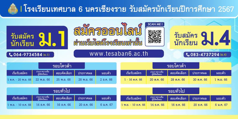 13 ต.ค. 2023 17256 โรงเรียนเทศบาล 6 นครเชียงราย เปิดรับสมัครนักเรียน ม.1 และ ม.4 ประจำปีการศึกษา 2567