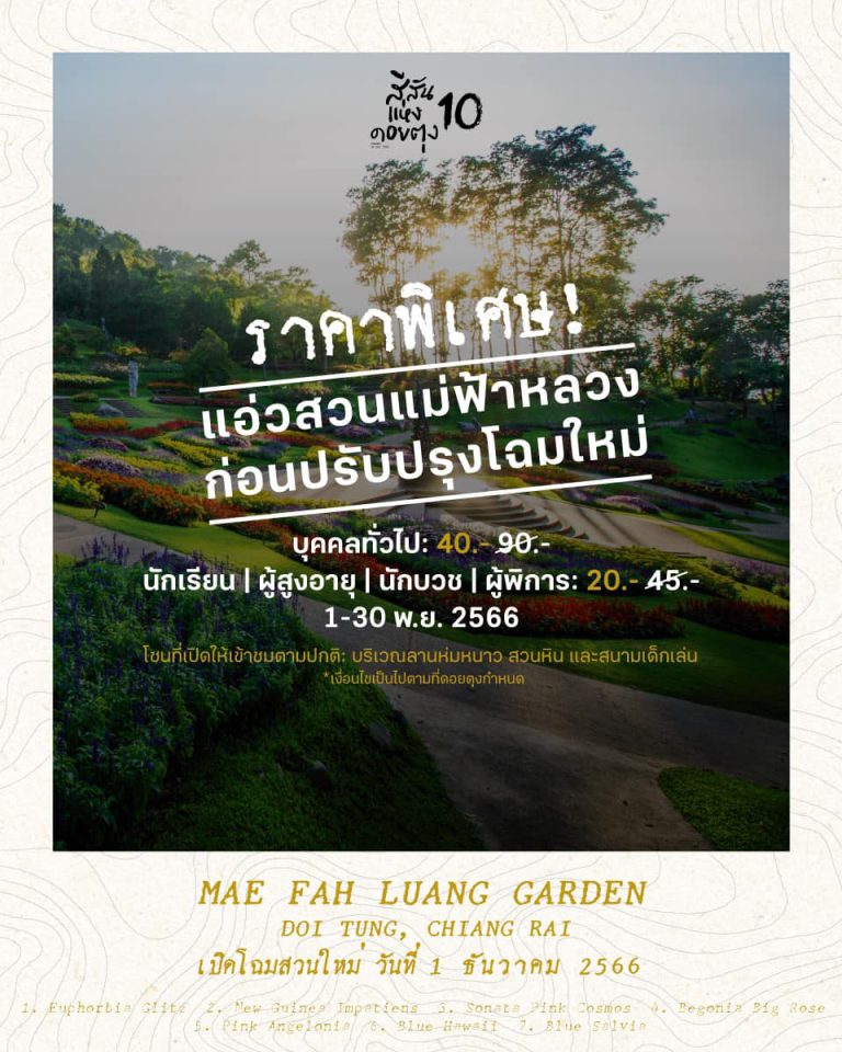 02 พ.ย. 2023 1606 1-30 พ.ย. 2566 | ชวนแอ่ว “สวนแม่ฟ้าหลวง ก่อนปรับปรุงโฉมใหม่ ในราคาพิเศษ!!