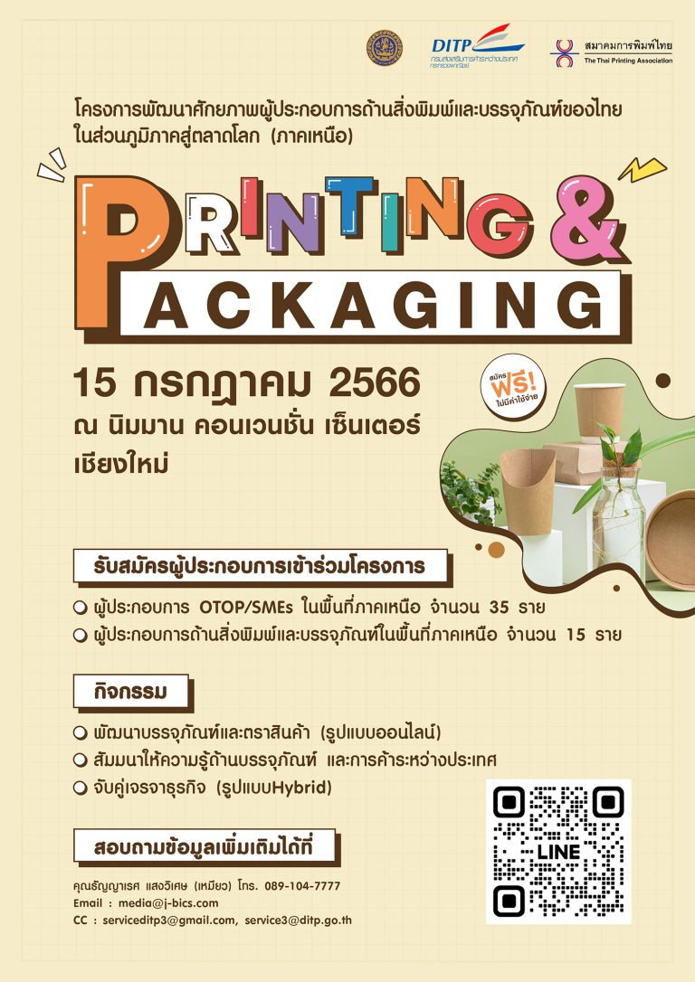 22 ก.พ. 2023 1192 เปิดรับสมัคร เข้าร่วมโครงการพัฒนาศักยภาพผู้ประกอบการด้านสิ่งพิมพ์และบรรจุภัณฑ์ของไทยในส่วนภูมิภาคสู่ตลาดโลก (ภาคเหนือ)