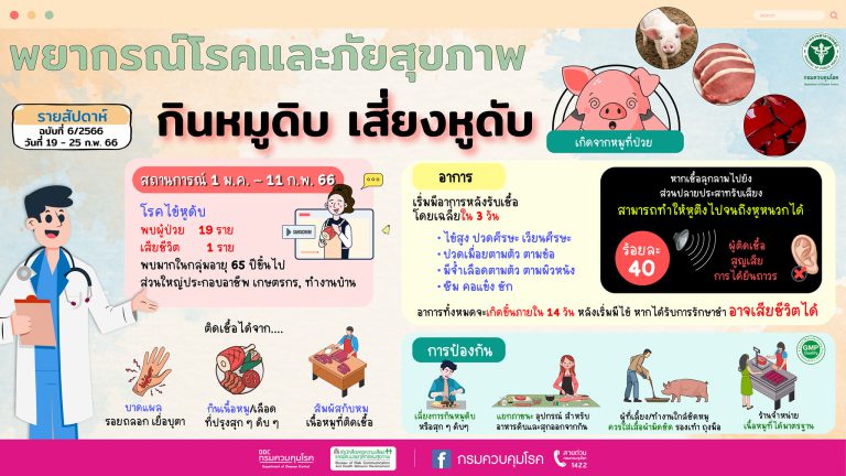 22 ก.พ. 2023 1127 กรมควบคุมโรค เตือน! “กินหมูดิบ เสี่ยงหูดับ” ..แนะประชาชน กินอาหารปรุงสุก ถูกหลักอนามัย ได้มาตรฐาน