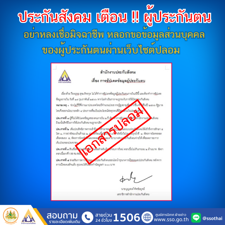 21 ก.พ. 2023 1040 ประกันสังคม เตือน!! ผู้ประกันตน “อย่าหลงเชื่อพวกมิจฉาชีพ” แอบอ้าง ชื่อ เลขาธิการ สปส. หลอกขอข้อมูลอัปเดตผู้ประกันตนผ่านเว็บไซต์ปลอม
