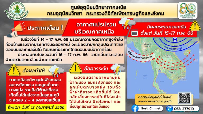 13 ก.พ. 2023 1409 เตือนภัยภาคเหนือ!! อากาศแปรปรวนระหว่างวันที่ 15-17 ก.พ.2566 #อุณหภูมิจะลดลง 2 – 4 องศาฯ