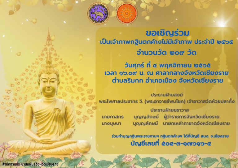 04 พ.ย. 2022 720 (วันนี้) ขอเชิญร่วมทำบุญพิธีถวายผ้ากฐินตกค้างไม่มีเจ้าภาพของจังหวัดเชียงราย ประจำปี 2565