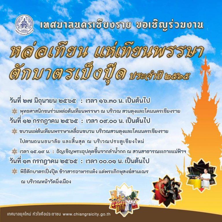 27 มิ.ย. 2022 3760 เชิญพุทธศาสนิกชนทุกท่านร่วมหล่อเทียนพรรษา31ต้นเทียนบริเวณสวนตุงและโคมนครเชียงราย