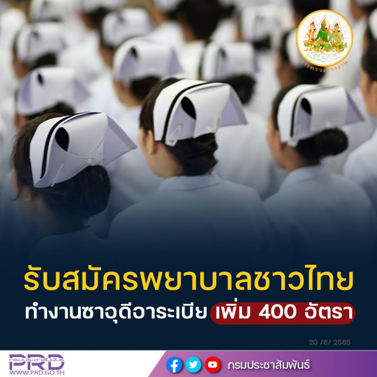 21 มิ.ย. 2022 1048 กระทรวงแรงงาน รับสมัครพยาบาลชาวไทยไปทำงานซาอุดีอาระเบียเพิ่ม 400 อัตรา เงินเดือนสูงสุด 1 แสนบาท