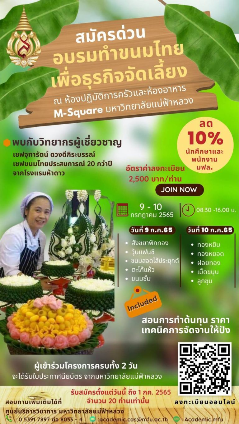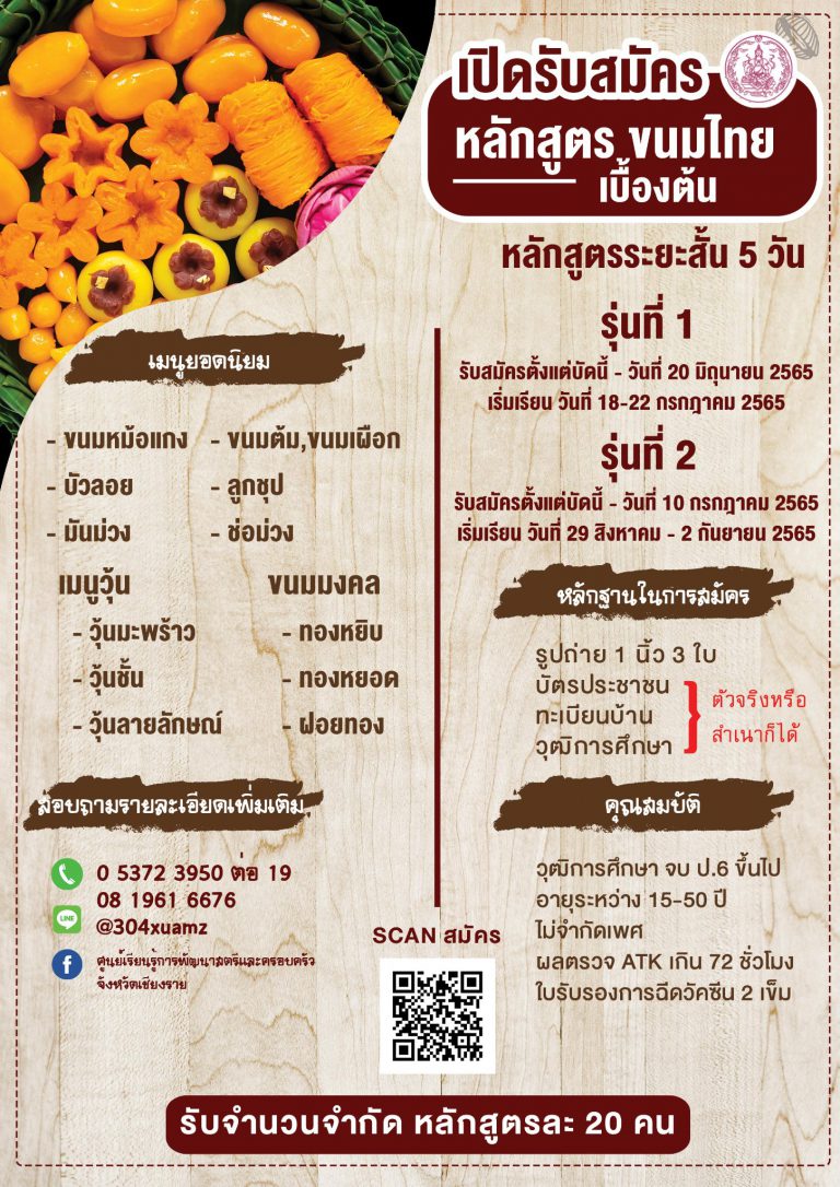 08 มิ.ย. 2022 3616 คลาสทำขนมไทยและเบเกอรี่ สนใจรีบสแกนลงทะเบียนด่วนจ้า รับจำนวนจำกัดนะคะ