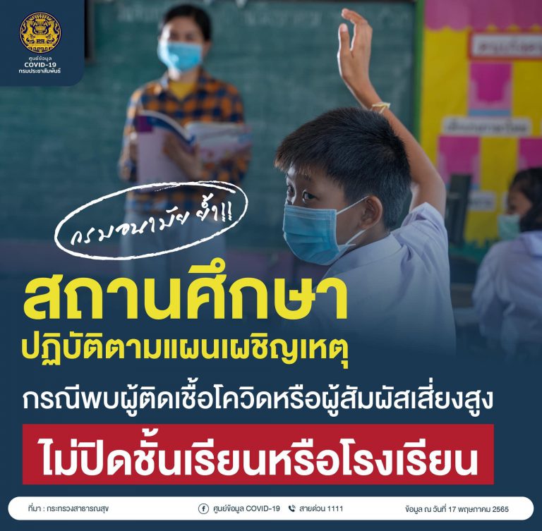 19 พ.ค. 2022 920 กรมอนามัย ย้ำ !! สถานศึกษาปฏิบัติตามแผนเผชิญเหตุ กรณีพบผู้ติดเชื้อโควิด หรือผู้สัมผัสเสี่ยงสูง ไม่ปิดชั้นเรียนหรือโรงเรียน