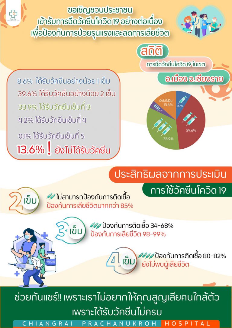 20 พ.ค. 2022 1672 เชิญชวนชาวเจียงฮาย เข้ารับการฉีดวัคซีนโควิด 19 อย่างต่อเนื่อง เพื่อป้องกันการป่วยรุนแรงและลดการเสียชีวิต