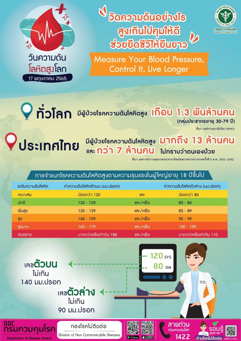 17 พ.ค. 2022 4339 17 พฤษภาคม “วันความดันโลหิตสูงโลก” กรมควบคุมโรคแนะวัดความดันโลหิตอย่างสม่ำเสมอ ป้องกันโรคความดันโลหิตสูง (สาระน่ารู้)