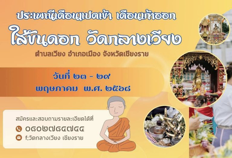 วันที่ 9-14 มีนาคม 2568 อำเภอแม่สายยังจัดงาน “นมัสการครูบาเจ้าศรีวิชัย ไหว้พระพุทธชินราช ตามรอยศรัทธาไหว้สาพระธาตุดอยตุง” ณ วัดศาลาเชิงดอย โดยมีกิจกรรมสักการะพระพุทธชินราชจำลอง อนุสาวรีย์ครูบาเจ้าศรีวิชัย และท้าวเวสสุวรรณ รวมถึงพิธีปิดทองช่อฟ้า พิธีปล่อยปลา การออกร้านสินค้าพื้นเมือง และการแสดงศิลปวัฒนธรรม [cmruncode name="GoogleADS"] ขอเชิญทุกท่านเที่ยวงาน “นมัสการครูบาเจ้าศรีวิชัย ไหว้พ