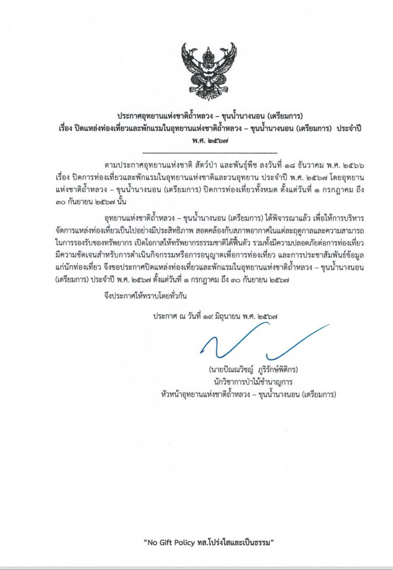 ประกาศ “ปิดแหล่งท่องเที่ยว” ในพื้นที่อุทยานแห่งชาติถ้ำหลวง – ขุนน้ำนางนอน (เตรียมการ) เป็นการชั่วคราว (ถึงวันที่ 30 ก.ย.65)
