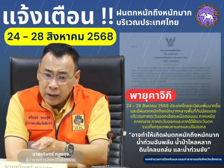 กองอำนวยการป้องกันและบรรเทาสาธารณภัยจังหวัดเชียงราย (กอปภ.จ.ชร) ได้ติดตามสภาพอากาศและพิจารณาปัจจัยเสี่ยง กอปรกับกรมอุตุนิยมวิทยาได้อัพเดทสถานการณ์พายุหมุนเขตร้อนเช้าตรู่วันนี้ (24/8/68) พายุโซนร้อนกำลังแรง "คาจิกิ (KAJIKI)" บริเวณทะเลจีนใต้ตอนบน ห่างจากเมืองดองฮอย ประเทศเวียดนาม ประมาณ 570 กม. กำลังเคลื่อนตัวทางตะวันตกด้วยความเร็ว 20 กม./ชม.(ช้าลงเล็กน้อย) พายุนี้มีแนวโน้มจะมีกำลังแรงขึ้นได้อีก เม