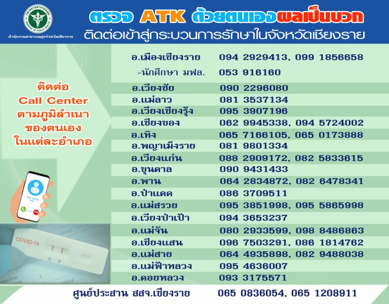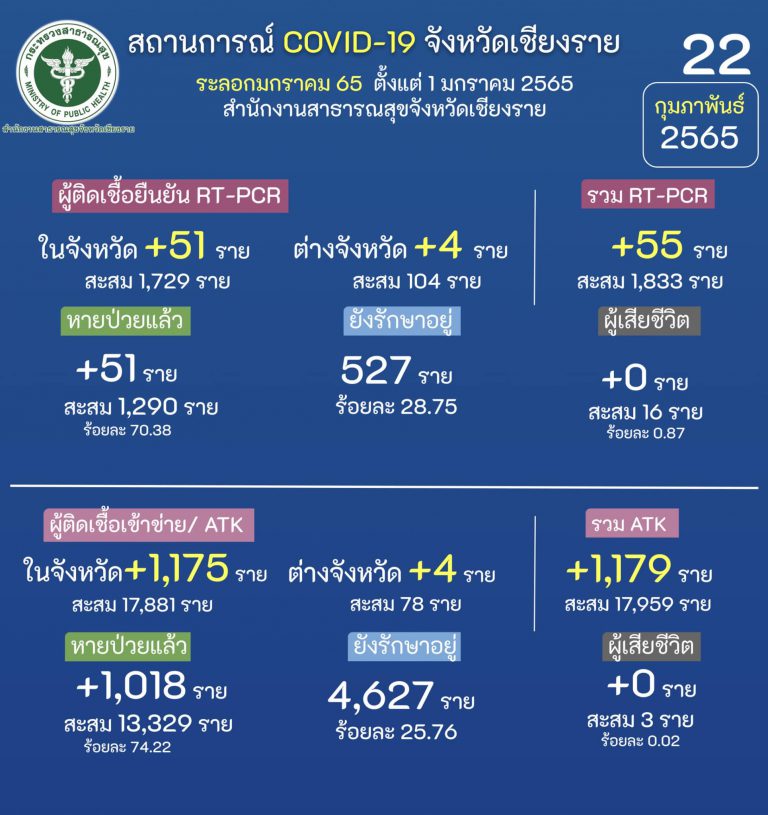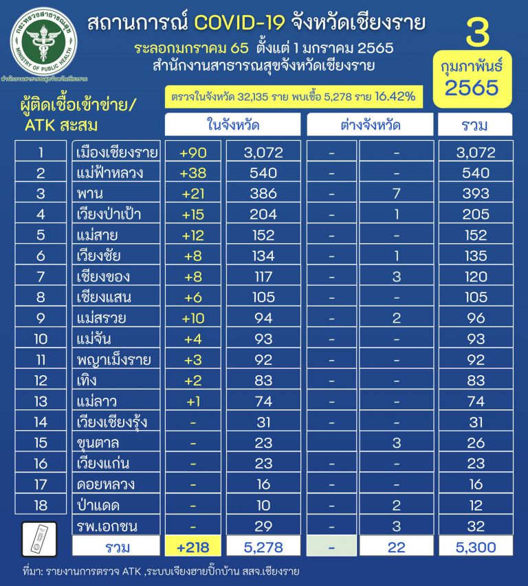 1. พบผู้ติดเชื้อตรวจ RT-PCR จำนวน 53 ราย 2.พบผู้ติดเชื้อ ตรวจ ATK รวม 634 ราย@ติดเชื้อภายในจังหวัด 51 ราย มาจาก- การสัมผัสผู้ป่วย 23 ราย- อยู่ระหว่างการสอบสวนโรค 11 ราย- ไม่มีประวัติสัมผัส +4 ราย - ครอบครัว 5 ครัว +13 คน- อ.แม่สาย 23 ราย (ต.แม่สาย 9 ราย, ต.เวียงพางคำ 8 ราย, ต.โป่งงาม 2 ราย, ต.ศรีเมืองชุม 2 ราย, ต.โป่งผา 1 ราย, ต.ห้วยไคร้ 1 ราย)- อ.เมืองเชียงราย 18 ราย (ต.บ้านดู่ 7 ราย, ต.รอบเวียง